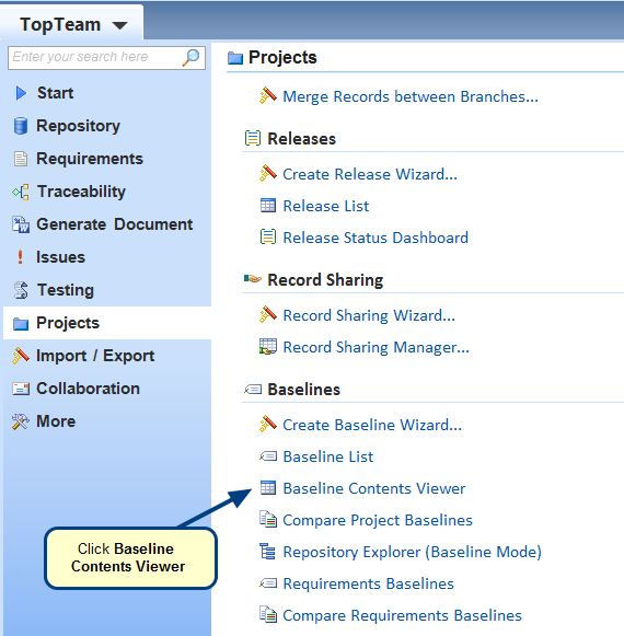 A baseline is a snapshot of specific versions of Repository Objects at the point the baseline is created. In the Baselines editor, you can view the details of a baselined record.