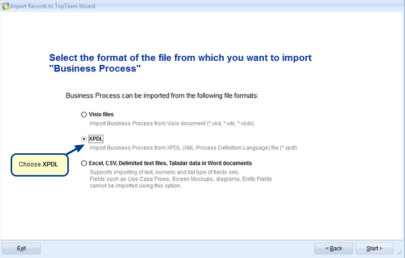 The Import Business Process from Microsoft Visio wizard enables you to import existing Business Processes created in Microsoft Visio into TopTeam.