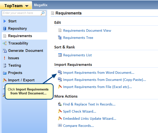 - TopTeam main menu – From the TopTeam Home screen, open TopTeam main menu. Select Requirements and click Requirements Tree.