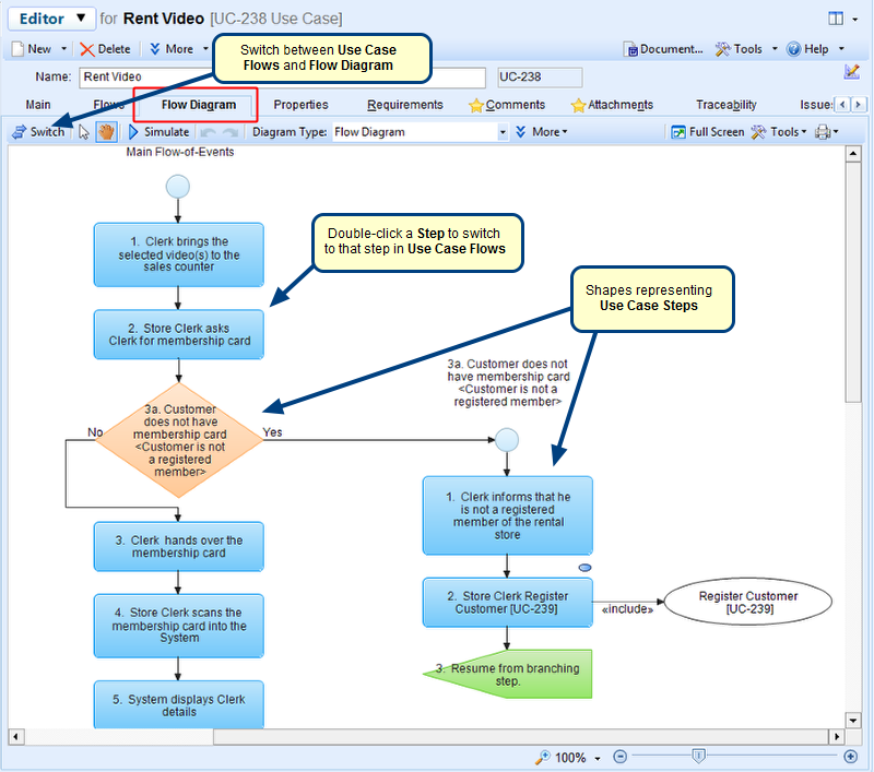 An Alternate flow describes a scenario that deviates from the basic Use Case Flow, where the end result completes successfully or fails to complete based on the steps taken in the flow. It can be drawn either before or after a linked step (branching step). By default, it will appear before a linked step.