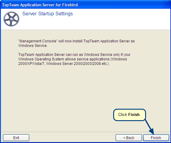 When TopTeam Application Server is configured to run as a Windows Application, it has to be manually started whenever the computer restarts. You can overcome this problem by installing TopTeam Application Server as a Windows Service.